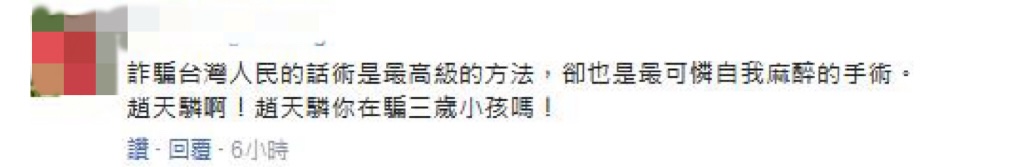 也有臺(tái)灣網(wǎng)友評(píng)論表示“果然是綠色邏輯思維,沒(méi)有最勇敢,只有最無(wú)知!”“趙天麟是在說(shuō)相聲嗎?真愛(ài)鬼扯!”“詐騙臺(tái)灣人民的話術(shù)是最高級(jí)的方法,卻也是最可憐自我麻醉的手術(shù)!趙天麟啊!趙天麟你在騙三歲小孩嗎?”