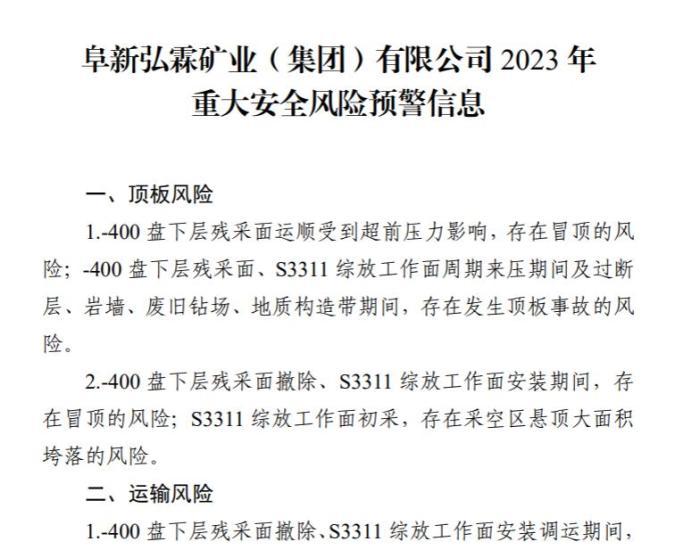 2021年2月,阜新市煤炭工業(yè)轉(zhuǎn)型發(fā)展局、遼寧煤監(jiān)局遼西監(jiān)察分局就曾發(fā)布2021年平安煤礦和弘霖煤礦重大安全風(fēng)險(xiǎn)預(yù)警信息,重大安全風(fēng)險(xiǎn)預(yù)判清單顯示,弘霖煤礦存在“超強(qiáng)度、超定員組織生產(chǎn)風(fēng)險(xiǎn)”“安全監(jiān)測(cè)監(jiān)控系統(tǒng)出現(xiàn)故障”等問題。