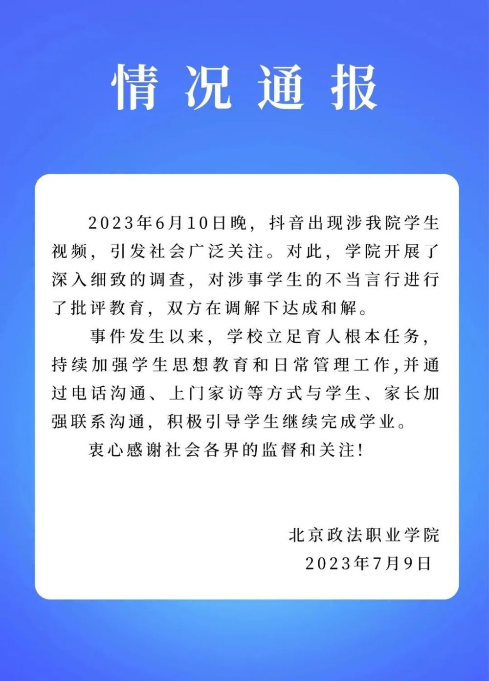 同時(shí),據(jù)北京政法職業(yè)學(xué)院,6月10日晚,抖音出現(xiàn)涉該院學(xué)生視頻,引發(fā)社會(huì)廣泛關(guān)注。對此,學(xué)院開展了深入細(xì)致的調(diào)查,對涉事學(xué)生的不當(dāng)言行進(jìn)行了批評教育,雙方在調(diào)解下達(dá)成和解。
