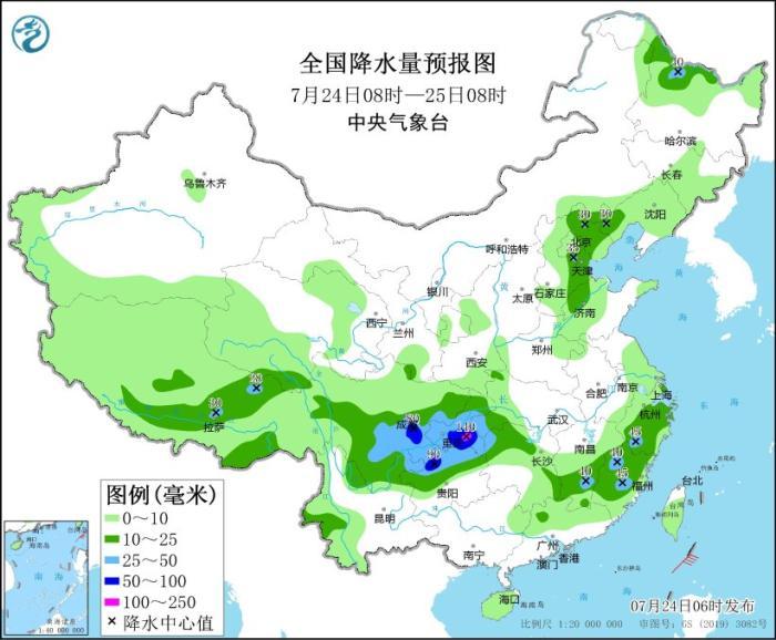 預(yù)計(jì),7月24日08時(shí)至25日08時(shí),四川盆地中南部、重慶大部、貴州北部、云南東北部、湖北西南部、湖南西北部以及浙江南部、福建中北部、江西南部、黑龍江北部、西藏東部等地部分地區(qū)有大到暴雨,其中,重慶南部等地局部地區(qū)有大暴雨(100~140毫米)。上述部分地區(qū)伴有短時(shí)強(qiáng)降水(最大小時(shí)降雨量30~50毫米,局地可超過70毫米),局地有雷暴大風(fēng)等強(qiáng)對(duì)流天氣。中央氣象臺(tái)7月24日06時(shí)繼續(xù)發(fā)布暴雨藍(lán)色預(yù)警。