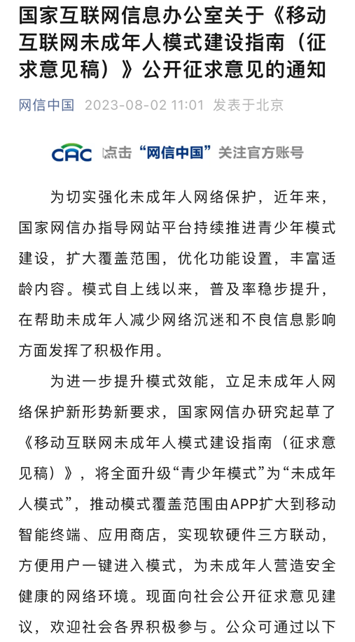 央廣網(wǎng)北京8月3日消息(總臺中國之聲記者馮爍)據(jù)中央廣播電視總臺中國之聲報道,為進一步幫助未成年人減少網(wǎng)絡沉迷和不良信息影響,國家網(wǎng)信辦8月2日發(fā)布了關于《移動互聯(lián)網(wǎng)未成年人模式建設指南(征求意見稿)》(以下簡稱《指南》)公開征求意見,將未成年人網(wǎng)絡保護的覆蓋范圍由App擴大到移動智能終端、應用程序、分發(fā)平臺,把“青少年模式”升級為“未成年人模式”。相關部門如何給未成年人網(wǎng)絡保護設置護欄?