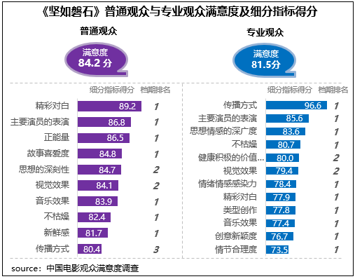 張藝謀導演新作《堅如磐石》獲得觀眾滿意度評分84.1分,居2023年國慶檔調查五部影片首位,作為聚焦反腐反黑的警匪題材影片,對于社會現(xiàn)實以及人性的描摹深度和豐富層次得到了觀眾的高度好評,思想性得分85.4分,為三大指數中最高,觀賞性得分84.4分,為檔期最高分,其中主要演員的表演得到了不同觀眾的高度評價,在2023年調查的50部影片中分別居普通觀眾評價的第6位和專業(yè)觀眾評價的第3位。