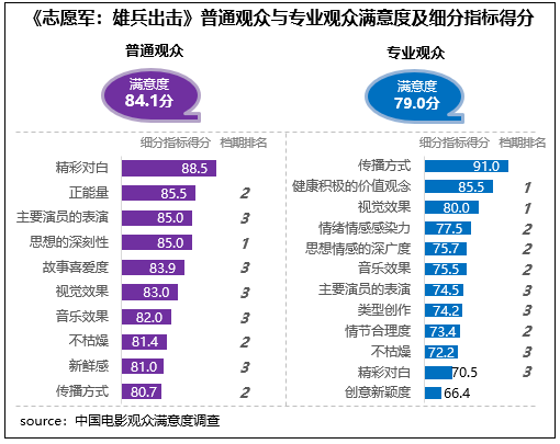 陳凱歌執(zhí)導的抗美援朝題材影片《志愿軍:雄兵出擊》觀眾滿意度83.8分,影片主題立意與國慶氛圍貼合,思想性得分85.0分,影片全景式呈現(xiàn)抗美援朝歷史,所傳遞的愛國精神和英雄氣概震撼人心,有85%的受訪觀眾表示在觀賞影片后感動不已。