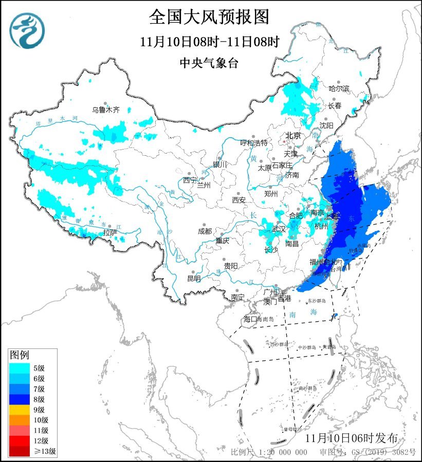 預(yù)計(jì),11月10日08時(shí)至11日08時(shí),內(nèi)蒙古中東部、遼寧西部、安徽中南部、河南南部、江蘇南部、上海、湖北南部、湖南東北部、江西北部、浙江北部及東部沿海、福建沿海、臺(tái)灣島沿海等地有5~6級(jí)、陣風(fēng)7~8級(jí)的大風(fēng);黃海大部海域、東海大部海域、臺(tái)灣海峽、臺(tái)灣以東洋面偏北海域、南海東北部偏北海域?qū)⒂?~8級(jí)、陣風(fēng)9~10級(jí)的大風(fēng)。