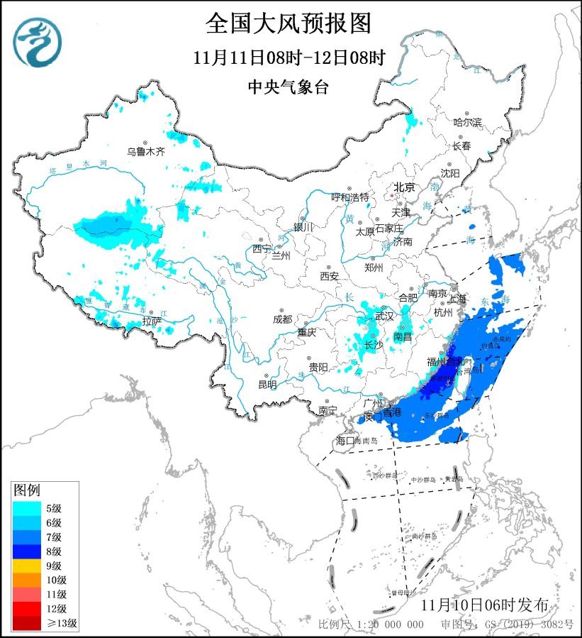 11月11日08時(shí)至12日08時(shí),安徽南部、湖北中東部、湖南大部、江西中北部、廣西東北部以及福建沿海、廣東東部沿海、臺(tái)灣島沿海等地有5~6級(jí)、陣風(fēng)7~8級(jí)的大風(fēng);東海大部海域、臺(tái)灣海峽、臺(tái)灣以東洋面、南海北部海域、巴士海峽偏北海域?qū)⒂?~8級(jí)、陣風(fēng)9~10級(jí)的大風(fēng)。