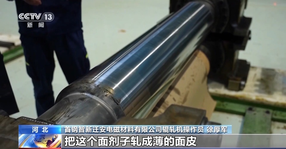首鋼智新遷安電磁材料有限公司輥軋機(jī)操作員 徐厚軍:這就是軋制和帶鋼直接接觸的工作輥,如果說家里搟面的話,這就是我們的搟面杖。那個鋼鐵材料就相當(dāng)于面劑子,我們就用這個搟面杖,通過擠壓,把這個面劑子軋成薄的面皮。6個搟面杖串起來,一遍就軋出來了。生產(chǎn)效率比傳統(tǒng)生產(chǎn)方法高了8倍到10倍,這條機(jī)組軋制速度是1500米每分鐘,相當(dāng)于高速公路上以時速90公里開的小車一直在跑。
