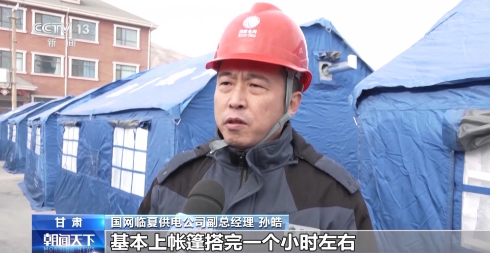 國網(wǎng)臨夏供電公司副總經(jīng)理 孫皓:基本上帳篷搭完一個小時左右,我們就能把電通上,因為每個點我們都有3到10名工作人員在跟進,充分地調動了我們所有的人員和力量,把這項工作放在最重要的位置上,把老百姓的電先供好。