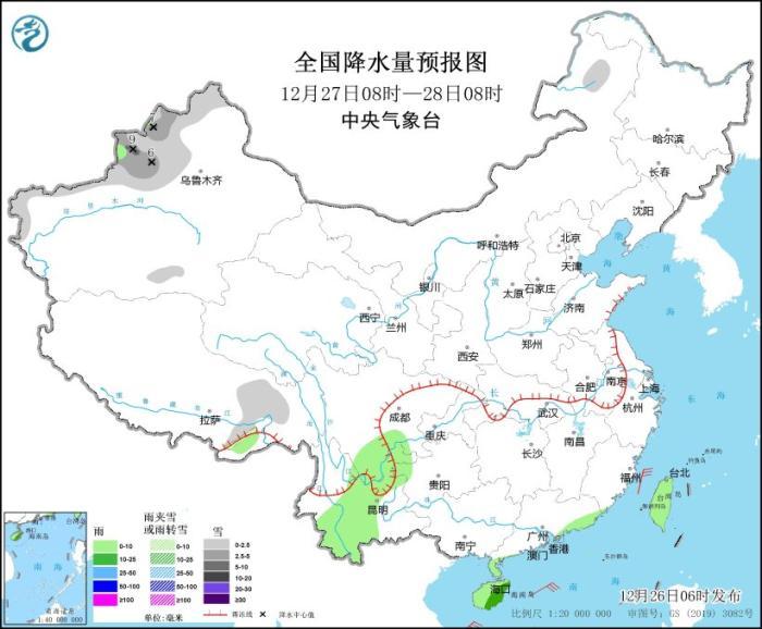 12月27日08時(shí)至28日08時(shí),內(nèi)蒙古東北部、新疆北部和南疆西部山區(qū)、西藏東部等地部分地區(qū)有小到中雪或雨夾雪,其中,新疆北疆北部和伊犁河谷等地部分地區(qū)有大雪(5~9毫米)。云南中部、廣東東南部沿海、海南島、臺(tái)灣島等地部分地區(qū)有小到中雨(見圖2)。