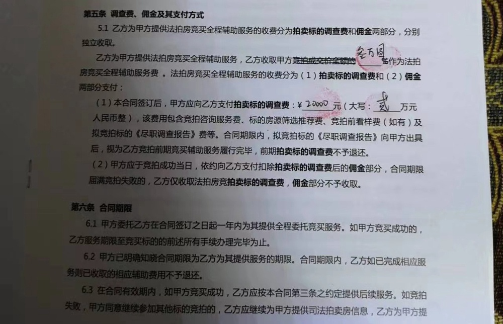最終,中介口中30萬出頭就可以拿下的房子,被加價到了39萬,李先生放棄了競拍。他算了一筆賬,按最終成交價再加上各種費用,這套法拍房不低于同戶型的二手房價格。房子沒拍到,之前交的兩萬元“調查費”也打了水漂。在李先生給記者提供的雙方合同中,有這樣的約定:“合同期限內,擬競拍標的《盡職調查報告》向甲方出具后,視為乙方競拍前期競買輔助服務履行完畢,前期拍賣標的‘調查費’不予退還”。
