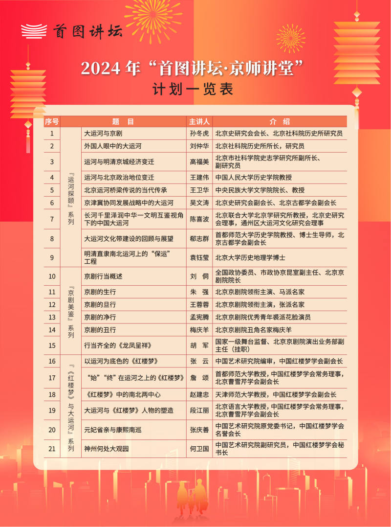 北京史研究會(huì)會(huì)長(zhǎng)孫冬虎發(fā)布“京師講堂”2024年度主題講座計(jì)劃。全年近50場(chǎng)講座,包括北京胡同四合院、三山五園、明清北京商業(yè)、龍年說(shuō)龍等歷史文化與社會(huì)生活主題,還有四項(xiàng)專題系列講座——“運(yùn)河探頤”系列將以大運(yùn)河的歷史變遷與運(yùn)河文化的挖掘、研究、傳承為焦點(diǎn),展示北京城市發(fā)展與大運(yùn)河的密切關(guān)系;“京劇美鑒”系列致力于讓聽眾體味京劇國(guó)粹的獨(dú)特風(fēng)韻與文化價(jià)值;“《紅樓夢(mèng)》與大運(yùn)河”系列將挖掘《紅樓夢(mèng)》與世界文化遺產(chǎn)大運(yùn)河之間的密切關(guān)聯(lián);“清朝宮廷”系列將還原清代宮廷生活的真實(shí)場(chǎng)景,提升聽眾關(guān)于清代歷史與文化的準(zhǔn)確認(rèn)知。