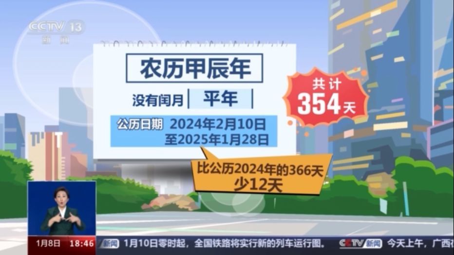 即將到來(lái)的農(nóng)歷甲辰年沒(méi)有閏月,因此是一個(gè)平年,其對(duì)應(yīng)的公歷日期為2024年2月10日至2025年1月28日,共計(jì)354天。所以比公歷2024年的366天少了12天。