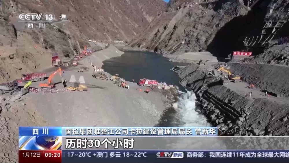 國投集團雅礱江公司卡拉建設管理局局長 曾新華:此次截流面對流量大、流速快、龍口水深、河床水位高、場地狹窄等難題。截流過程中,總共拋填石料超過12萬立方米,歷時30個小時。