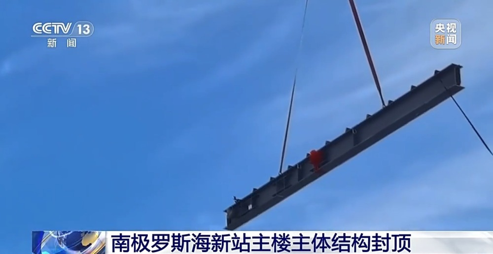 總臺央視記者 李寧:這里就是南極羅斯海新站的建設(shè)現(xiàn)場,現(xiàn)在正在進(jìn)行吊裝作業(yè)的就是新站主樓的最后一根鋼梁。為了慶祝這個(gè)重要的工程節(jié)點(diǎn),隊(duì)員們給這根鋼梁戴上了大紅花。隨著這根鋼梁的成功吊裝,標(biāo)志著羅斯海新站的主樓主結(jié)構(gòu)完成了封頂。
