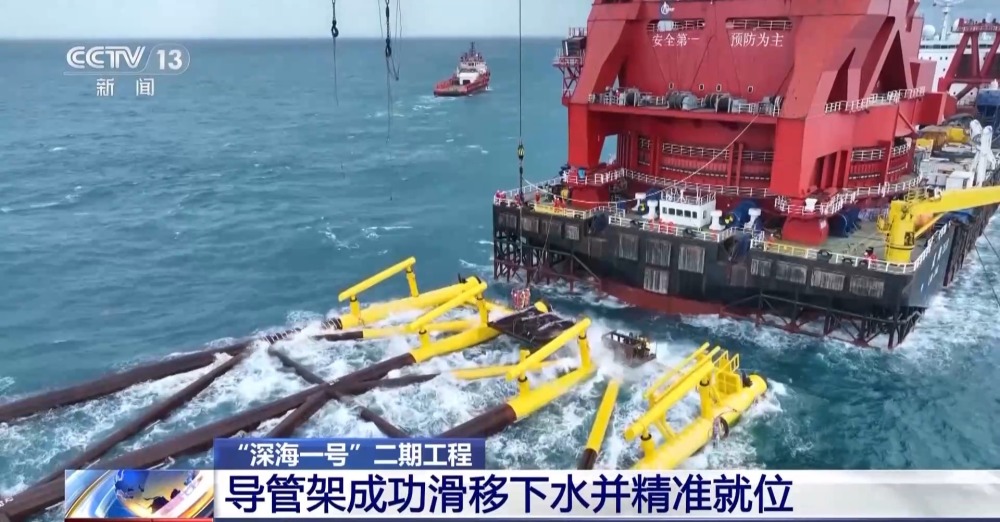 中國海油“深海一號”二期工程導(dǎo)管架海上安裝首席 黎世龍:“深海一號”二期工程導(dǎo)管架海上安裝采用滑移下水方式進(jìn)行。這種方式是利用導(dǎo)管架自身重力并配合液壓千斤頂助推,使導(dǎo)管架從駁船平穩(wěn)地滑入海中,再通過起重船將導(dǎo)管架吊裝扶正坐底,從而實現(xiàn)安裝就位。