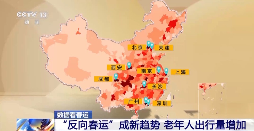數(shù)據(jù)顯示,今年“反向春運”趨勢明顯,更多的老年人選擇前往子女的工作地團(tuán)聚,他們的來源地主要集中在四川、河北、湖北、湖南等省份,而主要目的地則是北京、西安、天津、成都、廣州、上海、南京、深圳、長沙等一、二線中心城市。