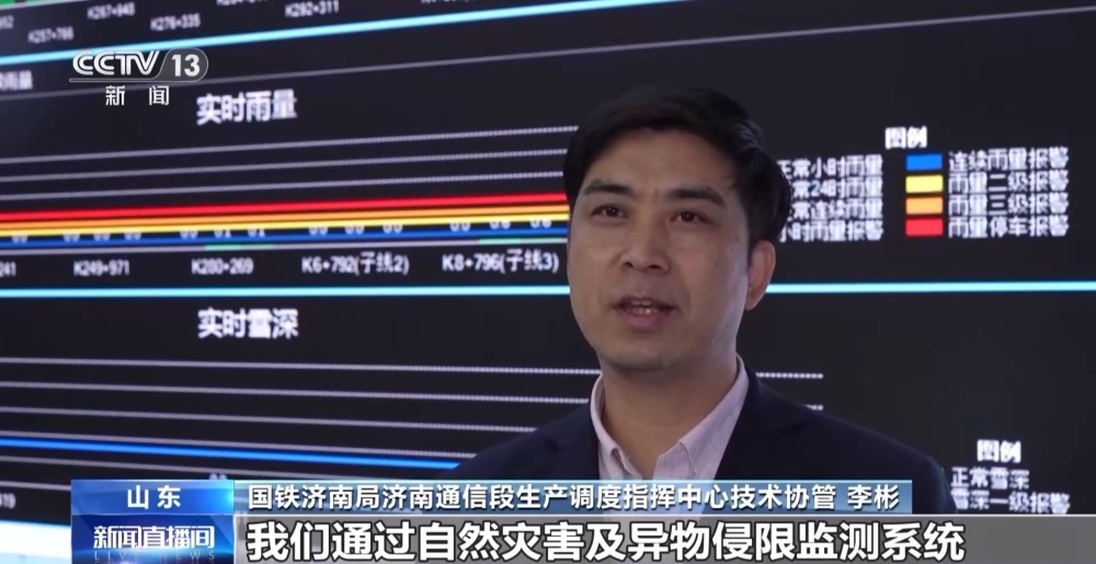 國鐵濟(jì)南局濟(jì)南通信段生產(chǎn)調(diào)度指揮中心技術(shù)協(xié)管 李彬:我們通過自然災(zāi)害及異物侵限監(jiān)測系統(tǒng),對轄區(qū)內(nèi)6000多公里鐵路線路、天氣、路況進(jìn)行分析。當(dāng)監(jiān)測點(diǎn)每小時(shí)降水量超過20毫米或瞬時(shí)風(fēng)力達(dá)到15米每秒、累計(jì)雪深超過50毫米時(shí),系統(tǒng)會自動發(fā)出告警信息,指導(dǎo)列車限速、降速運(yùn)行。