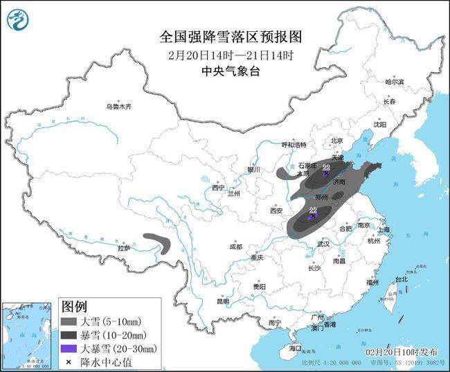 預(yù)計(jì)2月20日14時(shí)至2月21日14時(shí),陜西北部、山西東南部、河北南部、山東、河南、安徽北部、湖北西部、西藏東部等地部分地區(qū)有大到暴雪,其中,河北南部、河南南部等地局地有大暴雪(20~22毫米)。上述部分地區(qū)新增積雪深度3~8厘米,局地可達(dá)12厘米以上。