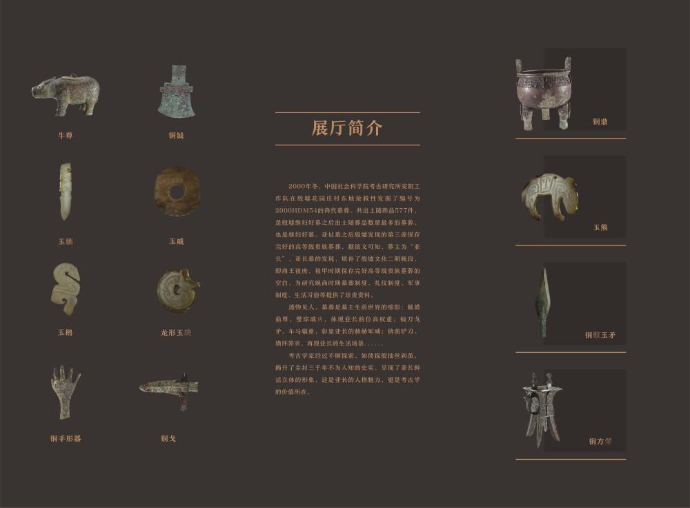 “長從何來-殷墟花園莊東地亞長墓專題展廳”以“亞長”這位殷商時期的大將軍為主人公,通過亞長墓出土的577件文物,生動展現(xiàn)了他的赫赫戰(zhàn)功、排兵布陣、生活起居等場景。亞長墓是殷墟繼婦好墓之后出土隨葬品數(shù)量最多的墓葬。據(jù)銘文可知,墓主為“亞長”。透物見人,墓葬是墓主生前世界的縮影:觚爵鼎尊、璧琮戚玦,體現(xiàn)亞長的位高權(quán)重;鉞刀戈矛、車馬輜重,彰顯亞長的赫赫軍威;錛鑿鏟刀、璜環(huán)笄觿,再現(xiàn)亞長的生活場景??脊艑W家經(jīng)過不懈探索,如偵探般抽絲剝繭,揭開了塵封三千年不為人知的史實,呈現(xiàn)了亞長鮮活立體的形象,這是亞長的人格魅力,更是考古學的價值所在。