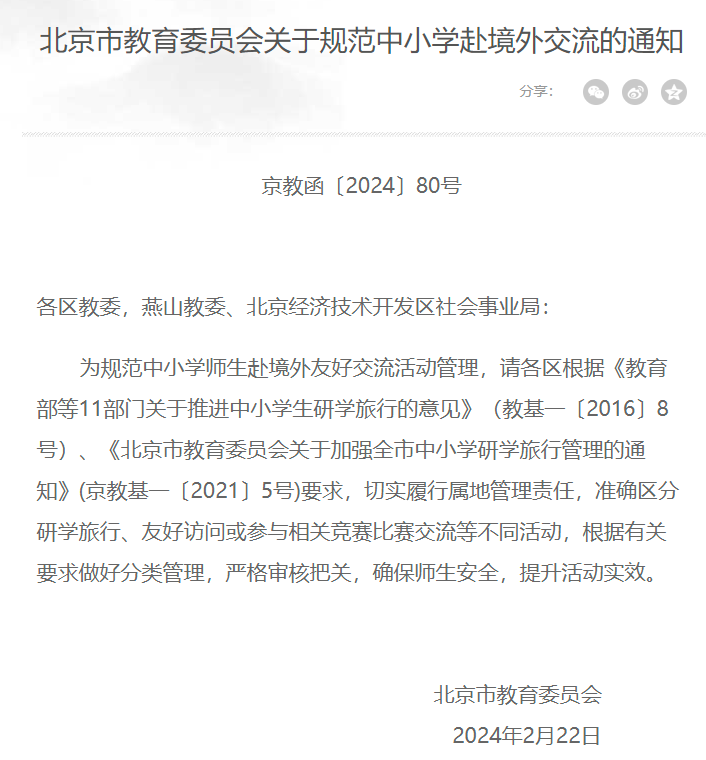 央廣網(wǎng)北京3月11日消息(記者馮儀)近日,北京市教委發(fā)布關(guān)于規(guī)范中小學(xué)赴境外交流的通知,通知中提到,請(qǐng)各區(qū)根據(jù)《教育部等11部門關(guān)于推進(jìn)中小學(xué)生研學(xué)旅行的意見》(教基一〔2016〕8號(hào))、《北京市教育委員會(huì)關(guān)于加強(qiáng)全市中小學(xué)研學(xué)旅行管理的通知》(京教基一〔2021〕5號(hào))要求,切實(shí)履行屬地管理責(zé)任,準(zhǔn)確區(qū)分研學(xué)旅行、友好訪問或參與相關(guān)競(jìng)賽比賽交流等不同活動(dòng),根據(jù)有關(guān)要求做好分類管理,嚴(yán)格審核把關(guān),確保師生安全,提升活動(dòng)實(shí)效。