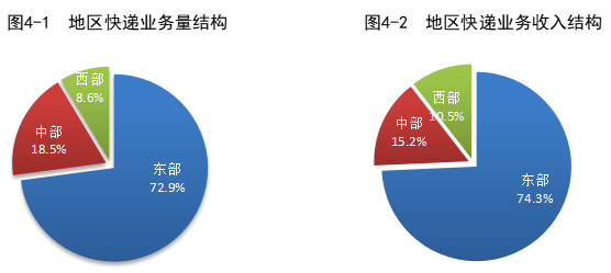1-2月,東、中、西部地區(qū)快遞業(yè)務(wù)量比重分別為72.9%、18.5%和8.6%,業(yè)務(wù)收入比重分別為74.3%、15.2%和10.5%。與去年同期相比,東部地區(qū)快遞業(yè)務(wù)量比重下降2.2個百分點,快遞業(yè)務(wù)收入比重下降1.2個百分點;中部地區(qū)快遞業(yè)務(wù)量比重上升1.5個百分點,快遞業(yè)務(wù)收入比重上升0.7個百分點;西部地區(qū)快遞業(yè)務(wù)量比重上升0.7個百分點,快遞業(yè)務(wù)收入比重上升0.5個百分點。