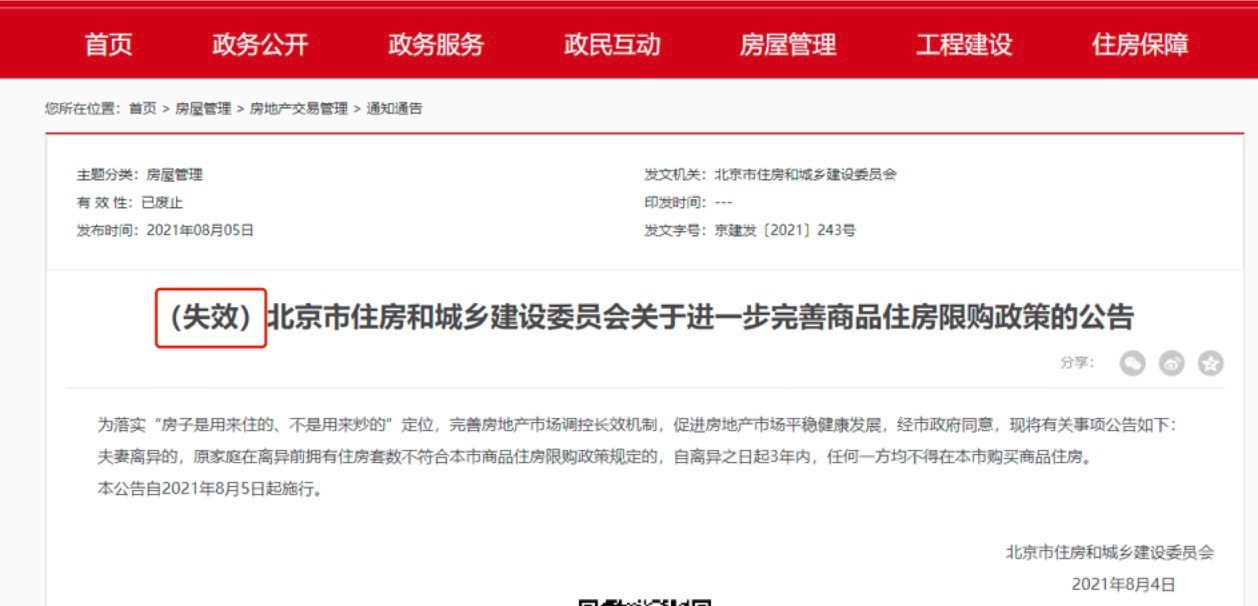 2021年8月4日,北京市住建委發(fā)文規(guī)定,夫妻離異的,原家庭在離異前擁有住房套數(shù)不符合本市商品住房限購政策規(guī)定的,自離異之日起3年內(nèi),任何一方均不得在本市購買商品住房。