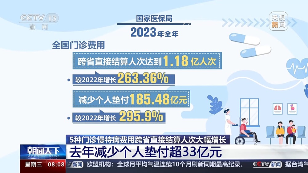 記者從國(guó)家醫(yī)保局獲悉,2023年,糖尿病、高血壓等5種門(mén)診慢特病費(fèi)用跨省直接結(jié)算人次出現(xiàn)了大幅增長(zhǎng),減少個(gè)人墊付超33億元。