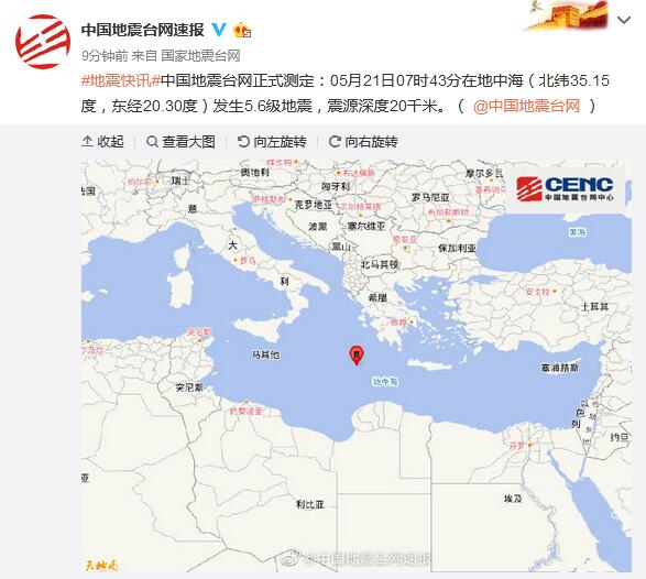 地中海發(fā)生5.6級地震 震源深度20千米