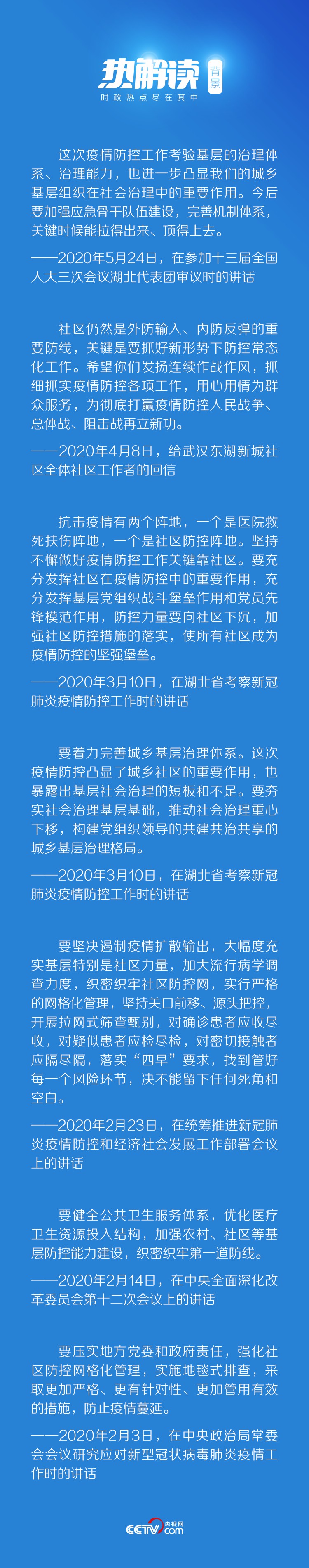 習(xí)近平在后來(lái)的講話中強(qiáng)調(diào),要“堅(jiān)持常態(tài)化精準(zhǔn)防控和局部應(yīng)急處置有機(jī)結(jié)合,加強(qiáng)社區(qū)精準(zhǔn)防控”,“健全疾控機(jī)構(gòu)與城鄉(xiāng)社區(qū)聯(lián)動(dòng)工作機(jī)制,加強(qiáng)鄉(xiāng)鎮(zhèn)衛(wèi)生院和社區(qū)衛(wèi)生服務(wù)中心疾病預(yù)防控制職責(zé),夯實(shí)聯(lián)防聯(lián)控的基層基礎(chǔ)”。