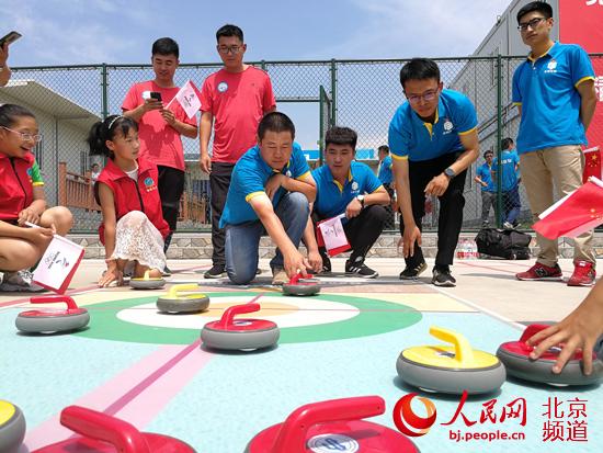 “海坨之星”地壺球隊的小隊員們,和冬奧工程一線建設(shè)者們一起打了一場充滿歡聲笑語的友誼地壺球賽。人民網(wǎng)尹星云 攝