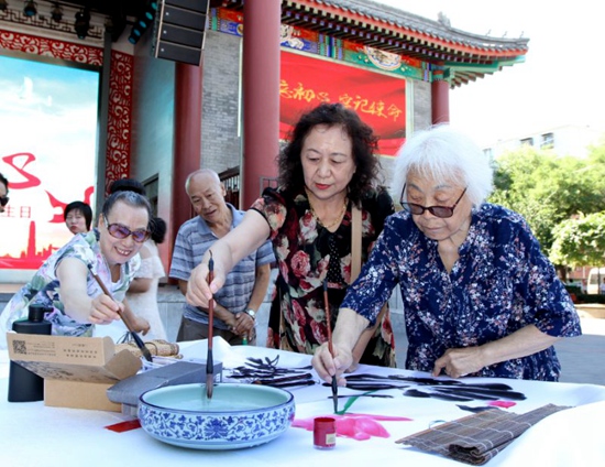 人民網(wǎng)北京6月30日電 6月30日上午,石景山區(qū)八角街道舉辦“百米畫卷繪初心”——老街坊手繪畫卷獻禮黨的生日活動,百余名老街坊揮毫潑墨祝福黨的生日,生動地描繪出對黨對祖國的深情厚意。