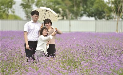 七彩花田總面積約5.6萬平方米,采用宿根花卉、草本花卉間種的形式,可實現(xiàn)春、夏、秋三季均有花可觀。昨天記者在現(xiàn)場看到,7000平方米的紫色馬鞭草成片盛開,風吹花浪起伏。據(jù)相關(guān)負責人介紹,七彩花田是空港生態(tài)綠廊項目的重要組成部分。目前,保稅區(qū)已建成公共綠地1020萬平方米。(文/記者 戰(zhàn)旗 圖/記者 賈磊)