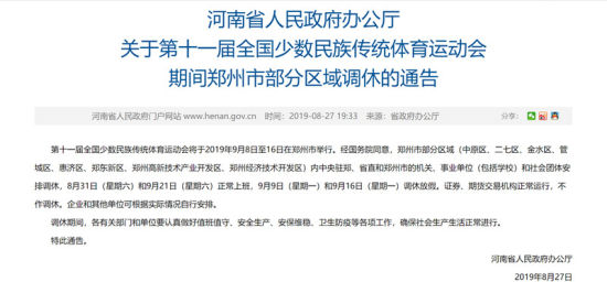 第十一屆全國少數民族傳統體育運動會將于2019年9月8日至16日在鄭州市舉行。經國務院同意,鄭州市部分區(qū)域(中原區(qū)、二七區(qū)、金水區(qū)、管城區(qū)、惠濟區(qū)、鄭東新區(qū)、鄭州高新技術產業(yè)開發(fā)區(qū)、鄭州經濟技術開發(fā)區(qū))內中央駐鄭、省直和鄭州市的機關、事業(yè)單位(包括學校)和社會團體安排調休,8月31日(星期六)和9月21日(星期六)正常上班,9月9日(星期一)和9月16日(星期一)調休放假。