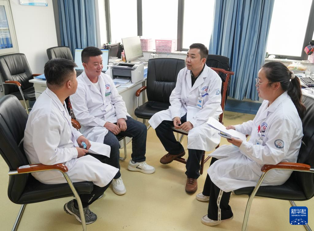 在日喀則市人民醫(yī)院,胡健衛(wèi)(右二)與徒弟段穎騫(左一)、張武(左二)、潘亞茹在辦公室內(nèi)開(kāi)會(huì)(7月8日攝)。新華社記者 丁汀 攝