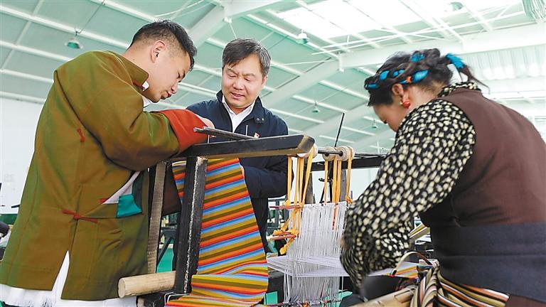 謝通門(mén)縣珠峰牛羊示范合作社內(nèi)工人正在編織氆氌。