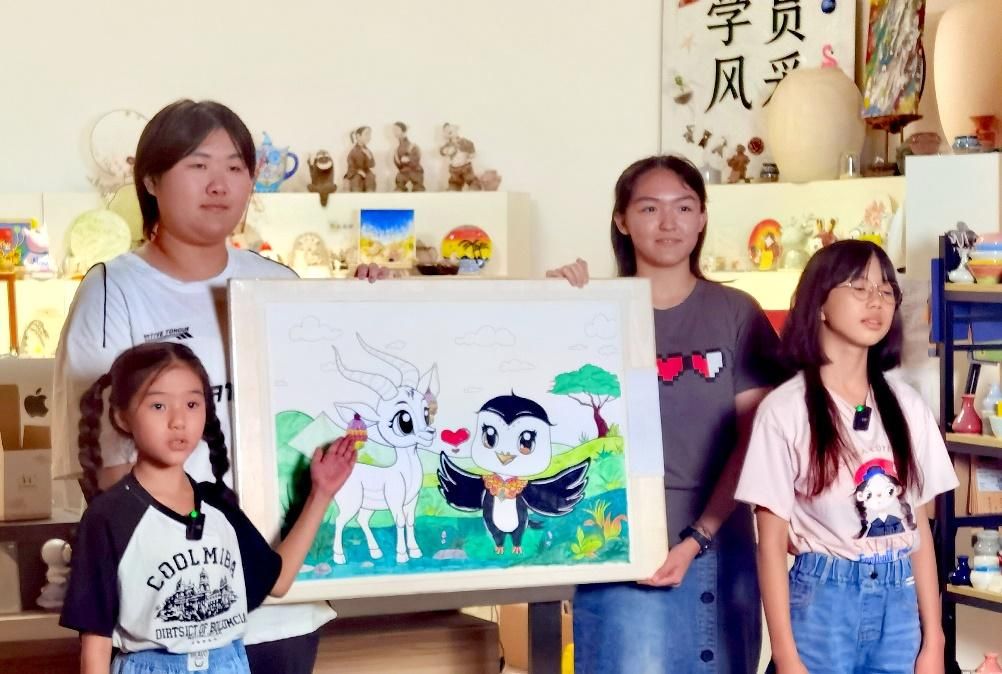 活動(dòng)期間,北京的劉心語、吳梓菡、文藝、吳辰希與西藏的旦增雍措、旦增尼瑪、徐杰、索朗央珍等兩地青少年代表,通過“同繪一幅畫”的方式,將西藏的藏羚羊與北京的雨燕巧妙地融合在一個(gè)畫面之中。畫作中,一邊是象征北京自由與活力的“空中旅行家”雨燕在無邊的藍(lán)天中翱翔,另一邊則是代表西藏堅(jiān)韌與生機(jī)的藏羚羊在遼闊的無人區(qū)自由奔跑。盡管兩者習(xí)性迥異、棲息地不同,它們共同展現(xiàn)了自由無束的特質(zhì),寓意著京藏兩地青少年盡管生活在不同的文化環(huán)境中,卻都能追求自由和快樂的成長。正如北京的孩子們說:“我們把來自拉薩的藏羚羊和來自北京的小雨燕聚集到一起,畫在了一個(gè)畫面中??矗翰亓缪虼髦刈宥?,小雨燕身著云領(lǐng)服飾,她們是盛裝出席啊。就像我們,北京和西藏的同學(xué)們,手拉著手,心連著心,書信往來,學(xué)習(xí)探究,相互幫助,一起成長?!蔽鞑氐暮⒆诱f:“我們就像畫中的藏羚羊和北京雨燕一樣,心手相牽,互相鼓舞,用積極的態(tài)度學(xué)習(xí)、生活,成為祖國的好少年!”。