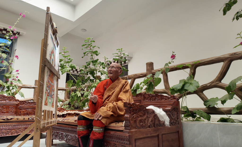 記者9月在西藏昌都市卡若區(qū)嘎瑪鄉(xiāng)見到92歲的嘎瑪?shù)吕諘r(shí),他坐在家中的暖閣里作畫,外孫丁增平措從旁協(xié)助。