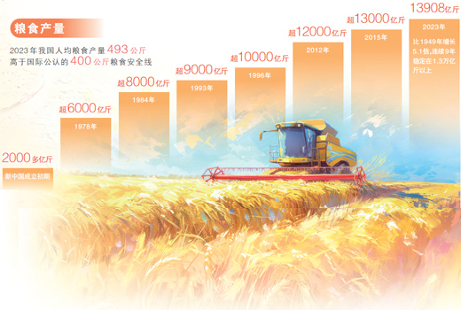 豐收成色十足?!安丶Z于地、藏糧于技”戰(zhàn)略深入實(shí)施,我國(guó)糧食綜合生產(chǎn)能力穩(wěn)步提升,連續(xù)9年穩(wěn)定在1.3萬(wàn)億斤以上。截至2023年,全國(guó)綠色、有機(jī)、名特優(yōu)新和地理標(biāo)志農(nóng)產(chǎn)品認(rèn)證登記總數(shù)達(dá)到7.5萬(wàn)個(gè)。蔬菜水果品種琳瑯滿目,居民的“菜籃子”“果盤(pán)子”更加豐富。