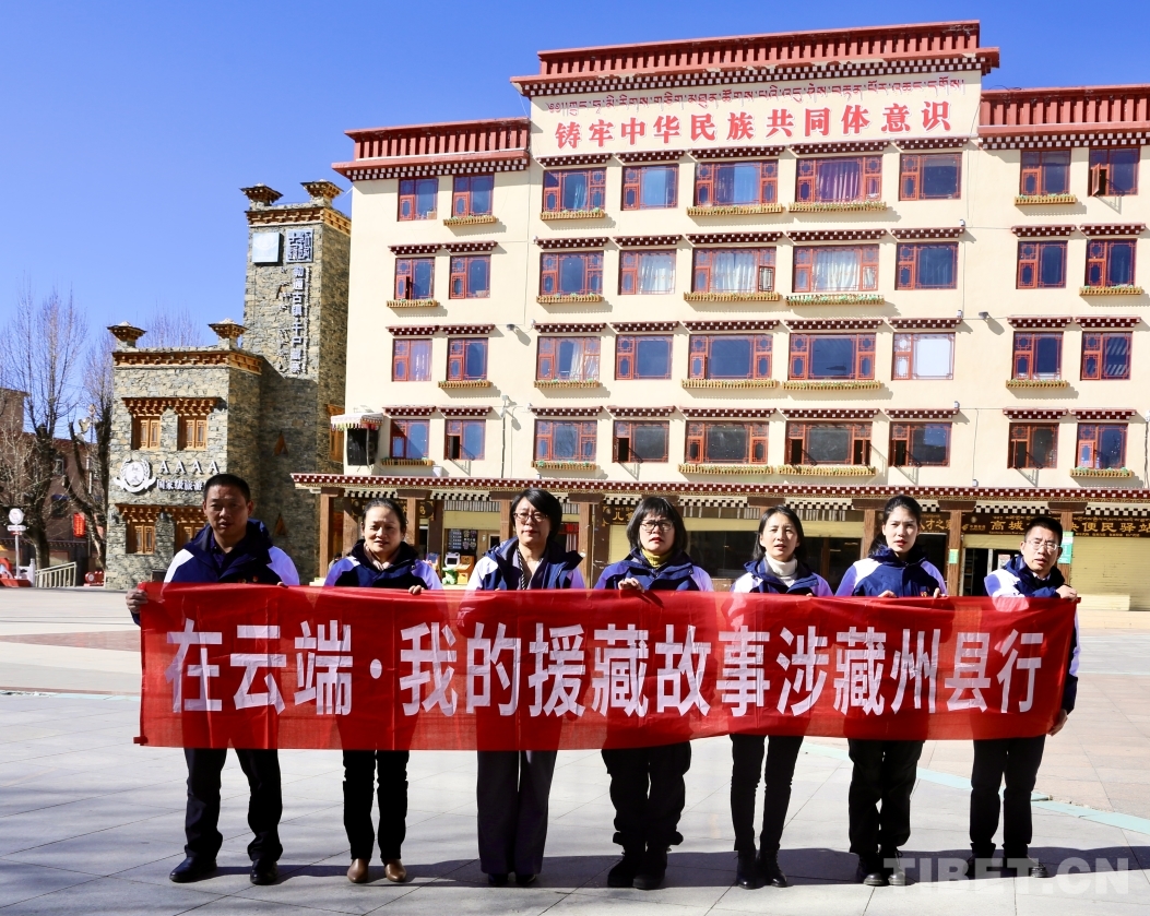 圖為宣講團(tuán)援藏干部代表在理塘縣格薩爾王廣場(chǎng)合影留念 攝影:龍真多吉