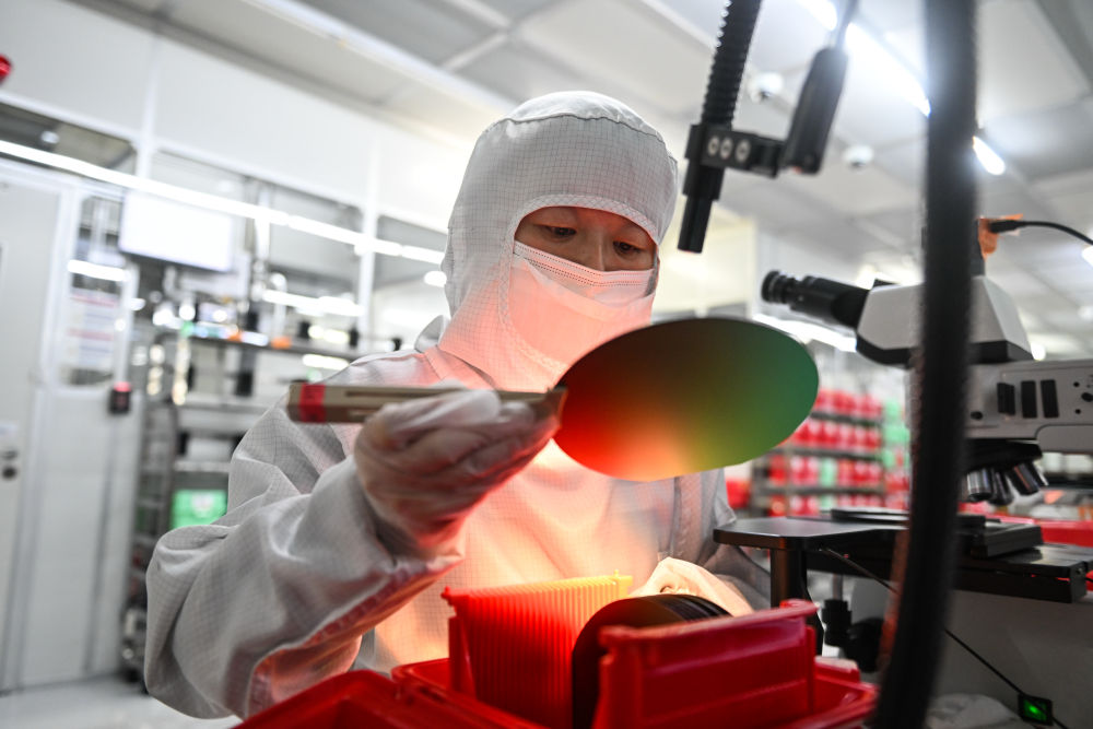 在蘇州工業(yè)園區(qū)納米產(chǎn)業(yè)技術(shù)研究院有限公司,工作人員在生產(chǎn)車間檢查晶圓質(zhì)量(2024年11月12日攝)。新華社記者 季春鵬 攝