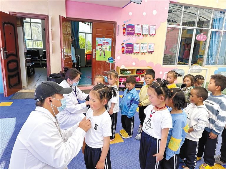 江蘇援藏醫(yī)療隊(duì)為墨竹工卡縣幼兒園的小朋友檢查身體。