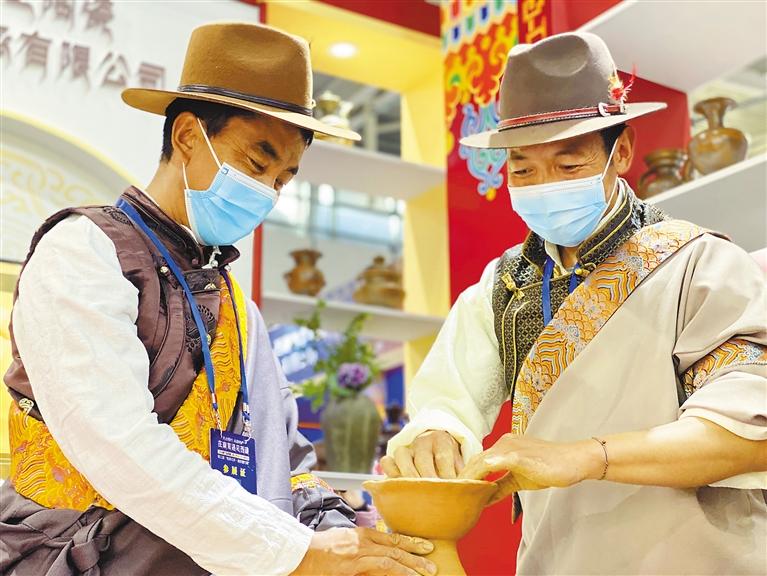 開幕式當天,塔巴陶瓷展館內,非物質文化遺產傳承人普旦扎西(左)與旦增晉美(右)在制作花瓶。