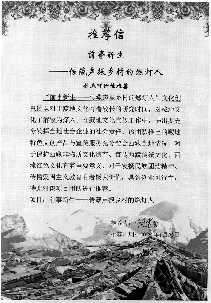 在西藏大學(xué)就讀期間,臧一陽參與的《夏爾噶-傳藏聲振興村的燃燈人》《西藏紅色資源合理開發(fā)利用政策研究》項目,分別獲得了第八屆中國國際“互聯(lián)網(wǎng)+”大學(xué)生創(chuàng)新創(chuàng)業(yè)大賽銀獎、自治區(qū)第八屆“成才杯”銀獎、國家級大學(xué)生創(chuàng)業(yè)項目等獎項。