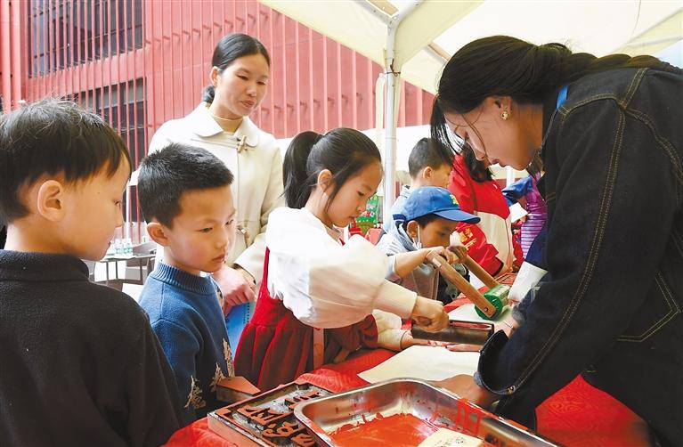 在西藏牦牛博物館,小朋友體驗雕版拓印技藝。記者 旦增蘭澤 攝
