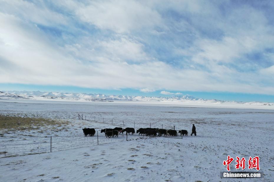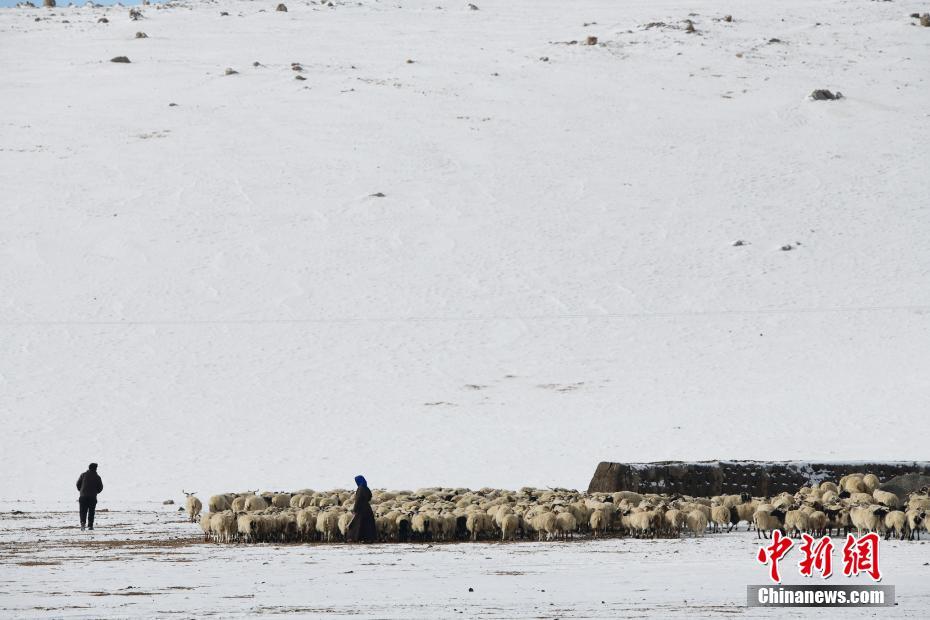 1月26日,牧民在納木錯(cuò)湖邊放牧。雪后的西藏納木錯(cuò)銀裝素裹,美景如畫(huà)。 中新社記者 貢嘎來(lái)松 攝