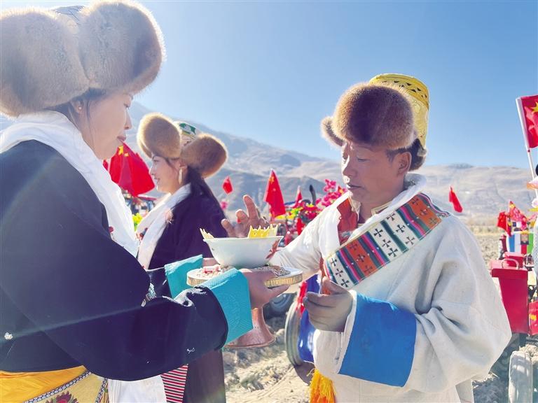 在克松村的田地旁,村民將拖拉機(jī)裝扮成“鐵?!?,用藏戲面具、彩色瓔珞等“打扮”一番,插著彩旗格外好看。村民還獻(xiàn)上哈達(dá)與自家釀的青稞酒給犁手、撒種子的姑娘和“鐵?!?,就開始了新春第一犁。