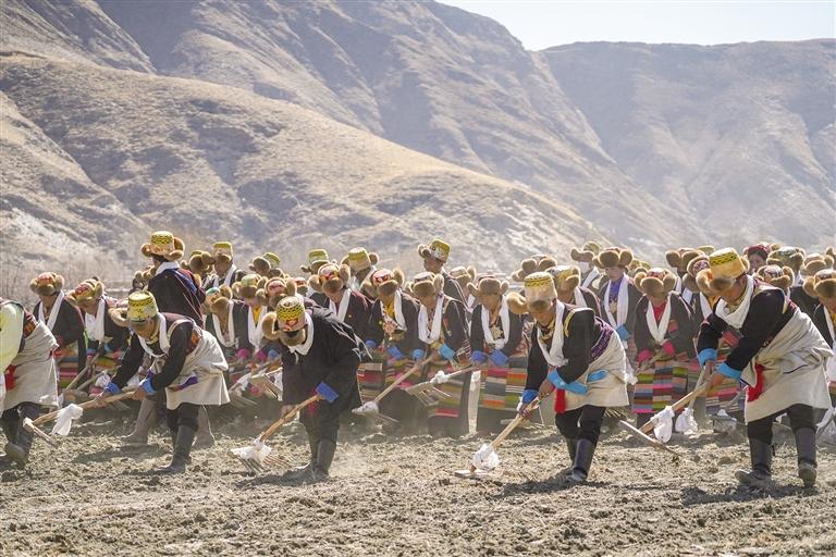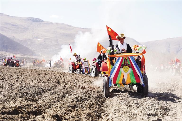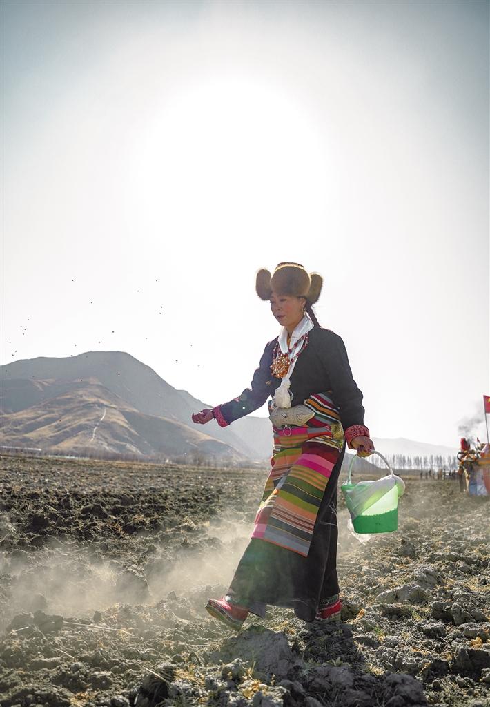 春耕儀式開始之前,犁手們依次吃糌粑、敬青稞酒、煨桑、獻(xiàn)哈達(dá),每個(gè)人臉上都流露著幸福的笑容?!拌F?!眰?cè)谔镩g一字排開,浩浩蕩蕩駛進(jìn)農(nóng)田,后面跟著盛裝打扮的姑娘,她們手持種子、肥料撒入農(nóng)田。這是來自春天的希望,希望秋收滿倉。