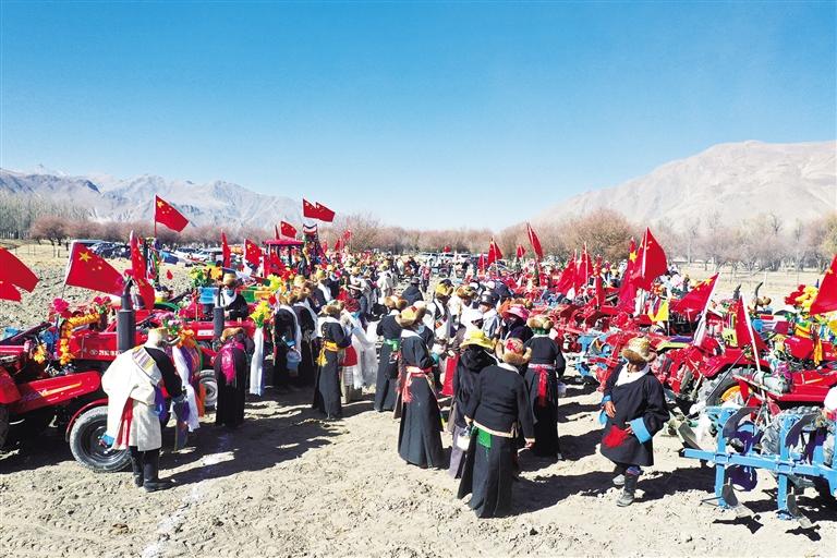 又是一年春耕季,3月16日,天氣晴朗、陽光明媚,記者一大早出發(fā)去山南市乃東區(qū)昌珠鎮(zhèn)克松村和拉薩市達(dá)孜區(qū)塔杰鄉(xiāng)巴嘎雪村參加春耕儀式。還沒走近田間,遠(yuǎn)遠(yuǎn)地就能看到鮮艷的五星紅旗、被裝扮成“鐵牛”的拖拉機(jī)、身著節(jié)日盛裝的群眾……他們齊聚在田間地頭等待著開啟春耕第一犁。