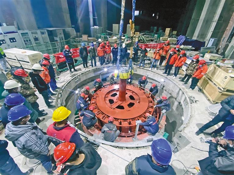 西藏湘河水利樞紐首臺機組轉(zhuǎn)子吊裝成功