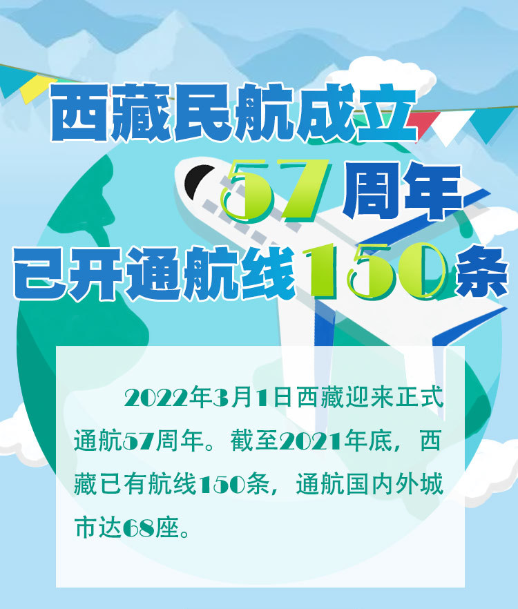2022年3月1日西藏迎來正式通航57周年。截至2021年底,西藏已有航線150條,通航國內外城市達68座。[詳細]