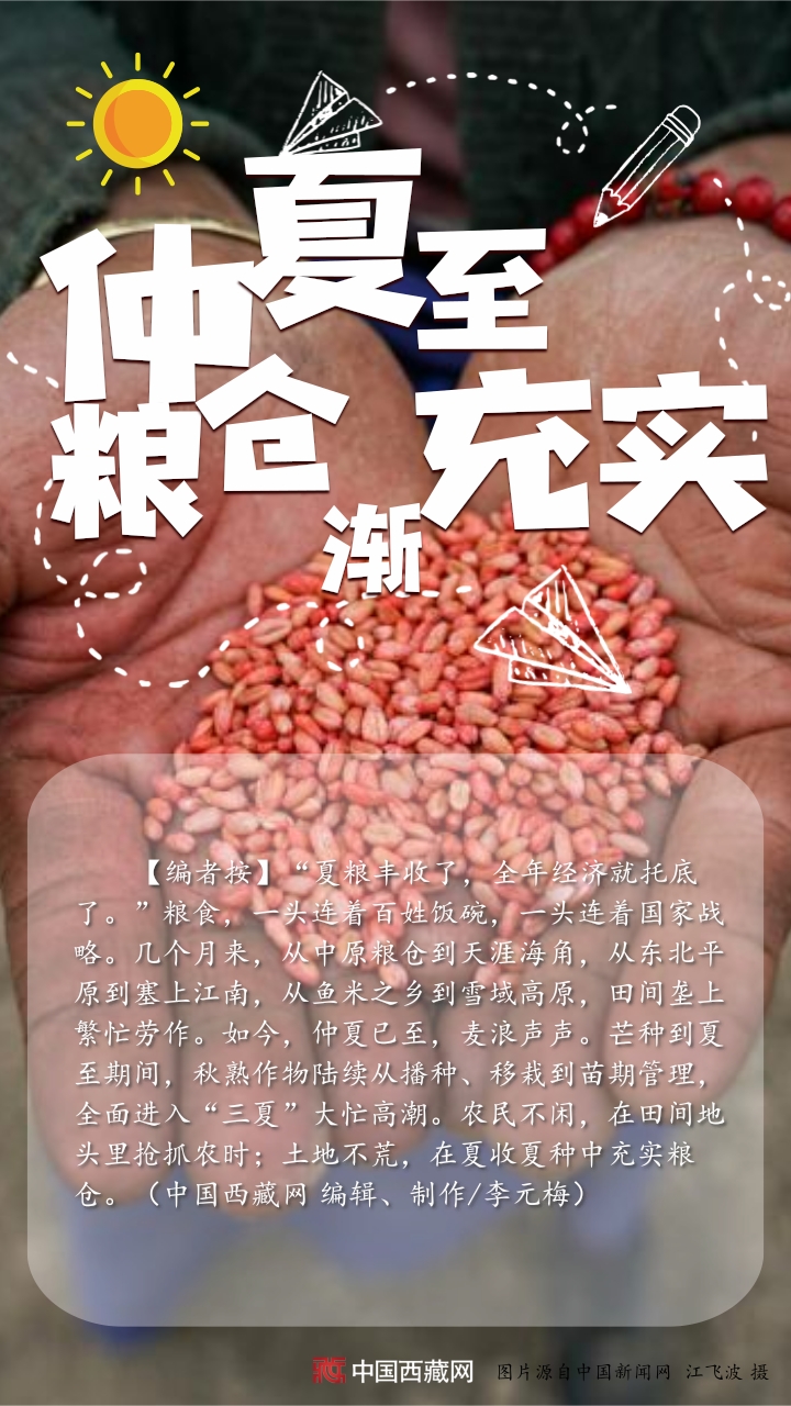 【編者按】“夏糧豐收了,全年經(jīng)濟就托底了?!奔Z食,一頭連著百姓飯碗,一頭連著國家戰(zhàn)略。幾個月來,從中原糧倉到天涯海角,從東北平原到塞上江南,從魚米之鄉(xiāng)到雪域高原,田間壟上繁忙勞作。如今,仲夏已至,麥浪聲聲。芒種到夏至期間,秋熟作物陸續(xù)從播種、移栽到苗期管理,全面進入“三夏”大忙高潮。農(nóng)民不閑,在田間地頭里搶抓農(nóng)時;土地不荒,在夏收夏種中充實糧倉。(中國西藏網(wǎng) 編輯、制作/李元梅)